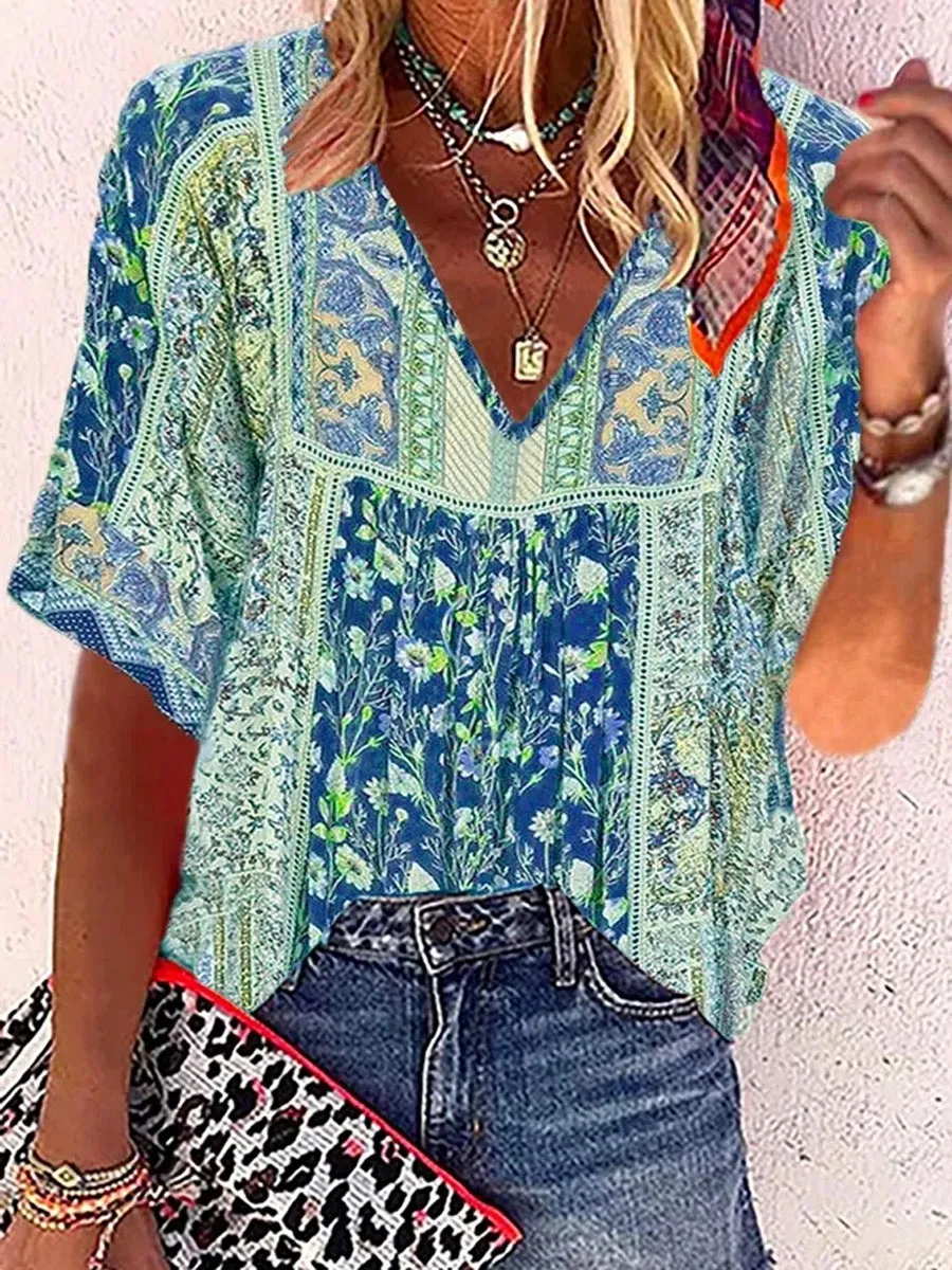 • V-neck Casual Loose Floral Print Short Sleeve Blouse